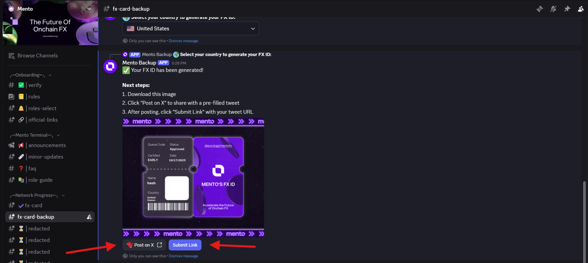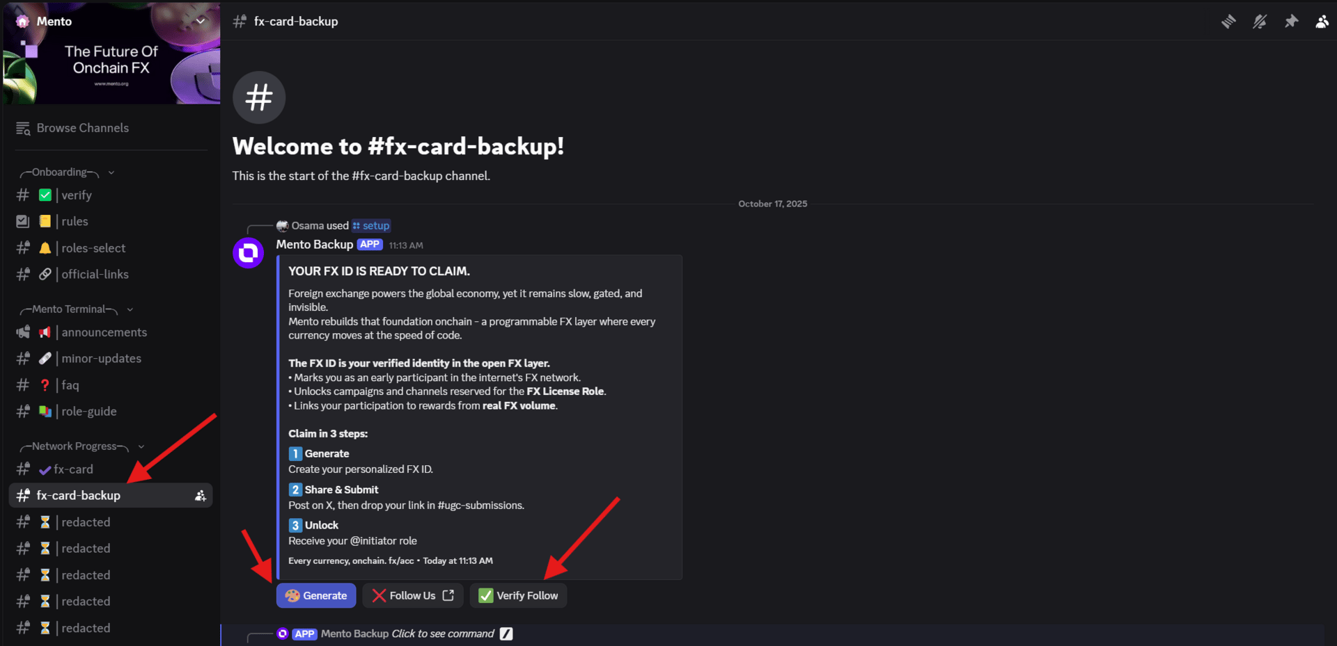Go to the fx-card or fx-card-backup channel. Follow their X account and confirm the subscription. Click ‘Generate Card’.