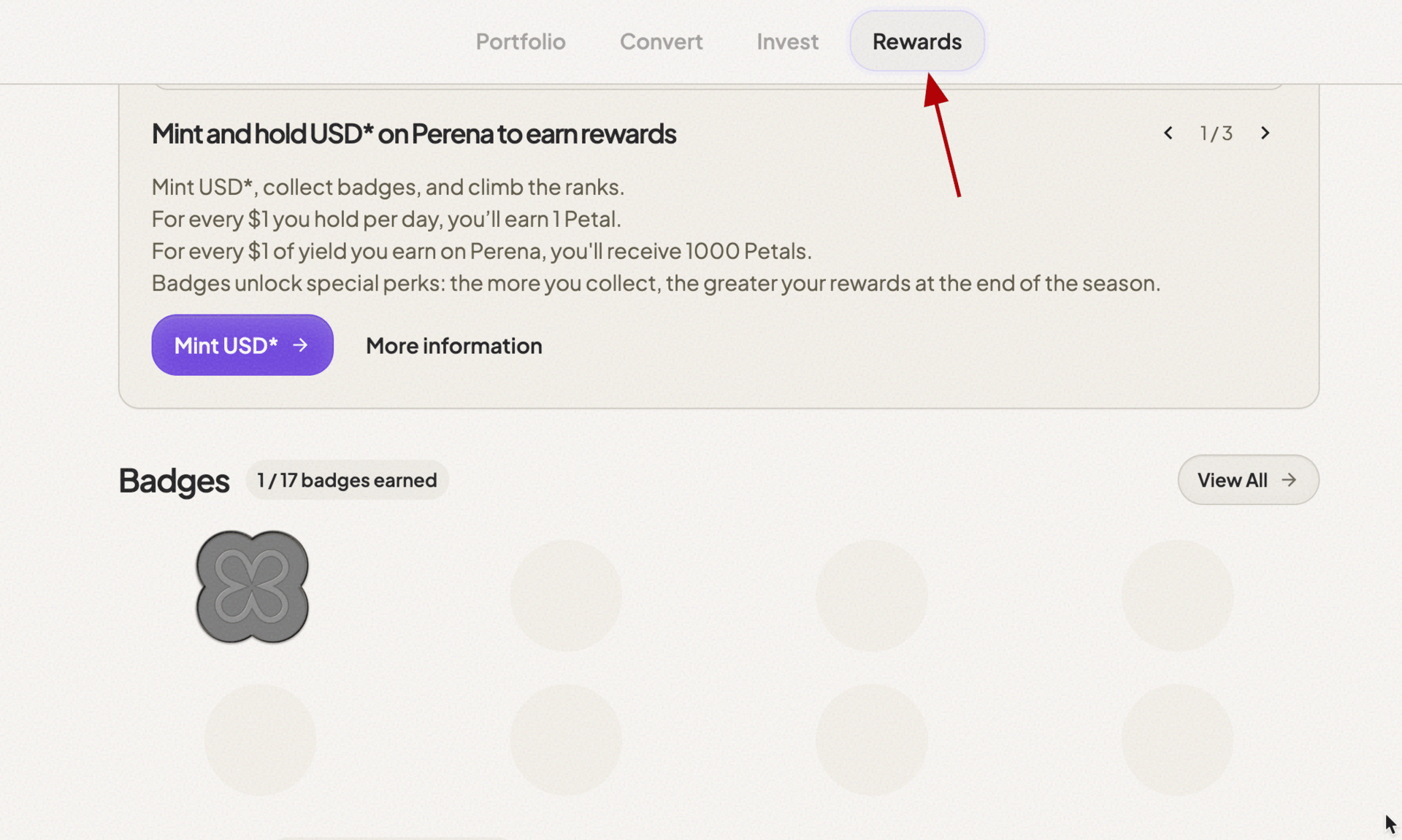 Perena has launched the first season of its points program! You can mint and hold USD*, collect badges and climb the leaderboard. For every $ you hold, you’ll earn 1 point every day. For every $ of yield you earn on Perena, you’ll receive a solid 1,000 points.