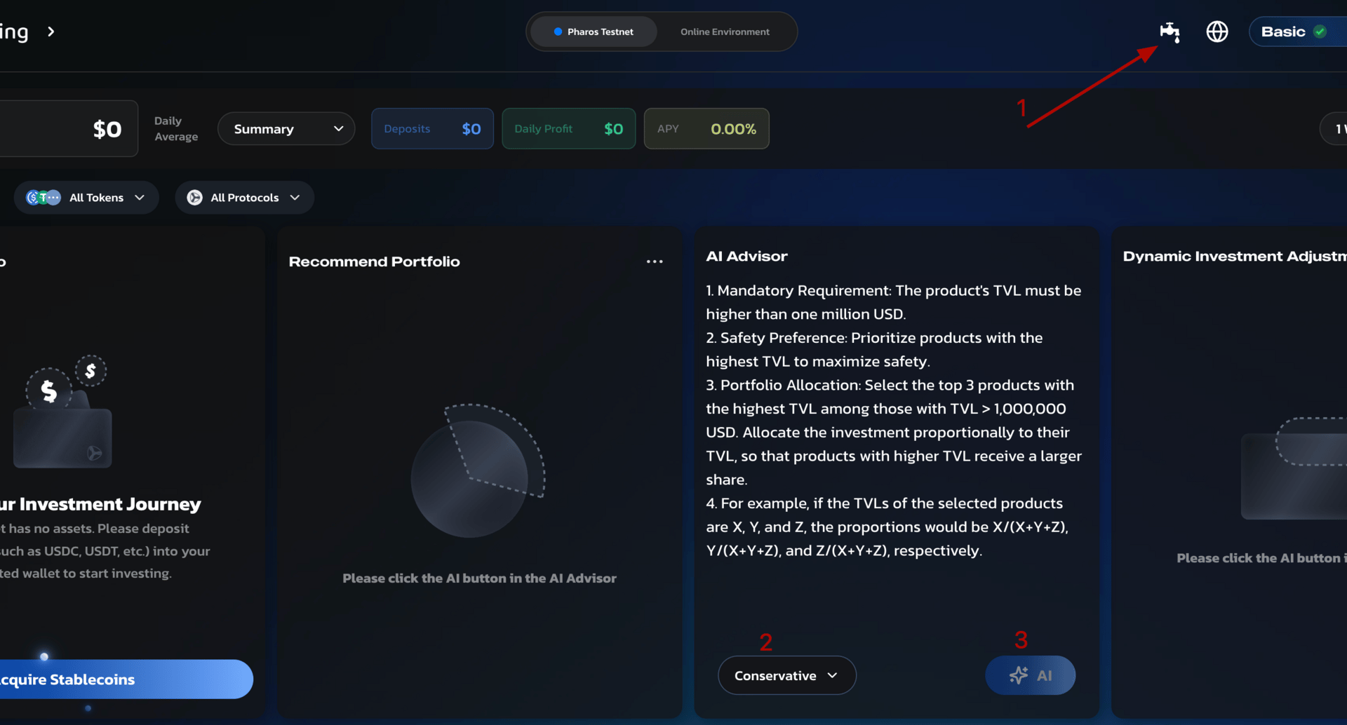Go to AutoStaking, connect your wallet, request test tokens, select a strategy, and click AI;