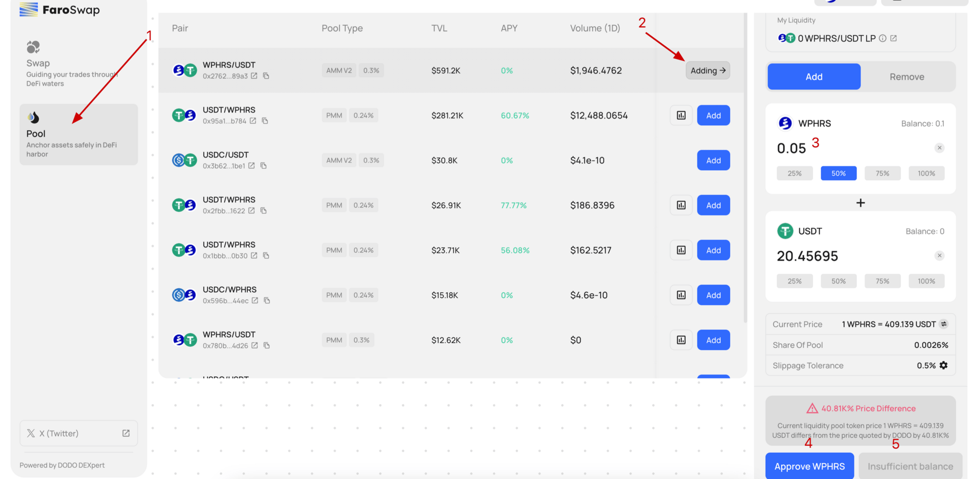 Open the Pool tab and add liquidity to one of the pools;